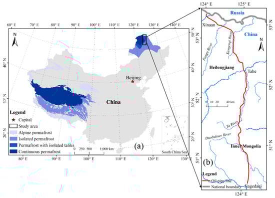 Location of the study region (from [], the reference system is Krasovsky 1940 Albers), (a) permafrost distribution in China, (b) pipeline location from Xing’an to Jiagedaqi.