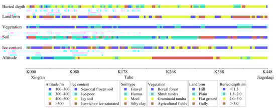 Distribution of the geological and geographic factors along the pipeline (from Xing’an to Jiagedaqi, by Origin 2015).