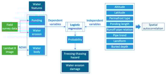 According to our previous research [], the surface flow trend along the CRCOP mainly focuses occurs east–west (0°). In general, when a pipe transects a surface flow, the risk of erosive damage is higher than in other sections that do not encounter a flow. The permafrost types in the study region were categorized in the model based on their ice content: 0% (seasonal frozen soil), 5% (ice poor), 15% (icy), 25% (ice rich), and 45% (ice saturated). The field investigation results of the ponding and water erosive sites were set as a categorical binary variable (where 1 represents yes, and 0 represents no), which were included in the regression model as a dependent variable. The attribute of each influential factor was set as an independent variable. After the regression, the weight of each influential factor was obtained from the coefficient of the independent variable(s). The probabilities of freeze–thaw hazards and water erosion were then calculated with the derived logistic regression model, which provided support for the intuitive understanding and proper treatment of threats along the pipeline. The analysis procedure for the water features and hazard probabilities is shown in Figure 3.