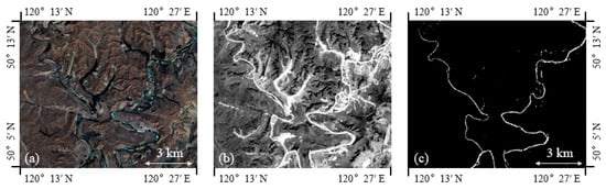Image processing of Landsat 8 data: (a) an original image, (b) normalized difference water index (NDWI) results, and (c) the extracted waterbody distribution.