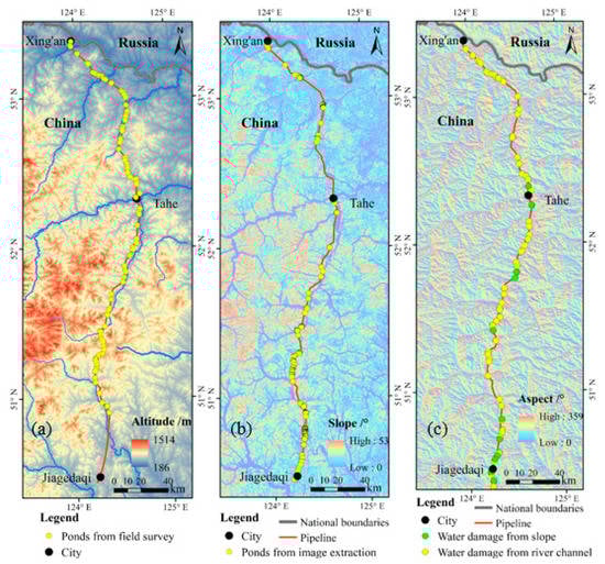 The study region is a 400 km length along the CRCOP in permafrost regions of northeastern China (Figure 1). The field survey focused on both sides of the pipeline within an average distance of 50 m from the pipeline. The extraction range of water features from the Landsat 8 remote sensing images was 300 m on both sides of the pipeline. Rugged terrain, marsh, and surface flows are present along the pipeline. There is also a high groundwater level, as well as complex permafrost environments and engineered geological conditions surrounding the CRCOP. The pipeline traverses a dense distribution of rivers in permafrost regions [,]. The field survey, which was conducted in August, 2018, identified 102 pond sites and 223 water erosion sites next to the pipeline.