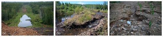 The China–Russia crude oil pipeline (CRCOP) begins in Skovorodino, Russia, enters China in Xing’an, Mohe County, and terminates in Daqing, Heilongjiang Province. The pipeline traverses a total of 441 km over permafrost regions []. The first line began operations in 2011, and the second line started operating in 2018. Along the pipeline, due to the complex topography, high forest coverage, and dense vegetation, stream flows have developed owing to the large amounts of precipitation and fertile soil in these regions. The process of pavement used when constructing the CRCOP changed local landforms and the flow paths of runoff, which resulted in the appearance of ponds and water erosion on both sides of the pipe embankment. These hazards increase the risk of frost heave and thaw settlement along the pipeline []. Due to interactions between the pipeline and the underlying permafrost, the thermal condition of the foundation soil varies markedly in different terrains. Freeze–thaw processes increase the maximum thawing depth under the pipe, which results in significant settlement []. The main freeze–thaw hazards along the CRCOP route are frost heave, thawing settlement, the formation of frost mounds, and damage caused by the use of ice pitons []. Frost heave caused by water migration and its subsequent freezing can cause pipe deformation. Seasonal frost mounds 1–1.5-m tall have appeared in regions with developed groundwater and ice-rich permafrost. Lateral extrusion and uplifting caused by frost mounds increase the risk of frost damage []. Ice pitons were found on gentle slopes of mountain fronts containing springs or rivers. Landslides can also occur on a permafrost slope due to rainfall and freeze–thaw cycles, which may generate tensile forces on the pipeline [,].