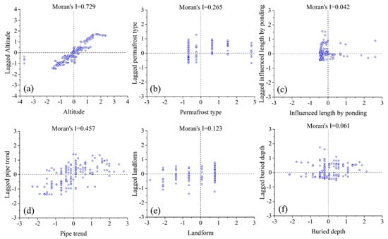 Moran’s indices (Moran’s I) of the altitude, permafrost type, pond length, pipe orientation, landform type, and buried pipe depth are shown in Figure 7. Moran’s I of each factor is greater than zero, which means the above six factors present a spatially positive correlation, which increases with an increase in the index value. According to the Moran’s I scatterplots, the spatial distributions of all attributes are dispersive. There is no obvious clustering among the six selected factors, which means the factors can be appropriately used to calculate the probability of freeze–thaw hazards and erosive damage.