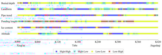 The distributions of the local indicators of spatial association (LISA) of the six above factors are shown in Figure 8. The LISA aggregations were divided into four categories: High–High (HH), High–Low (HL), Low–Low (LL), and Low–High (LH). HH and LL represent the aggregation of attributes with high values or low values, while HL and LH represent heterogeneous attribute distributions. Along the pipeline, the attributes of altitude, ice content, and pipe orientation have long sections with continuously homogeneous aggregations. The attributes of pond length, landform type, and buried pipe depth show discrete distributions. Except for pond length, the LISA aggregation of the other five factors is mainly distributed in the HH and LL quadrants, which account for 74.8% of the whole pipeline.