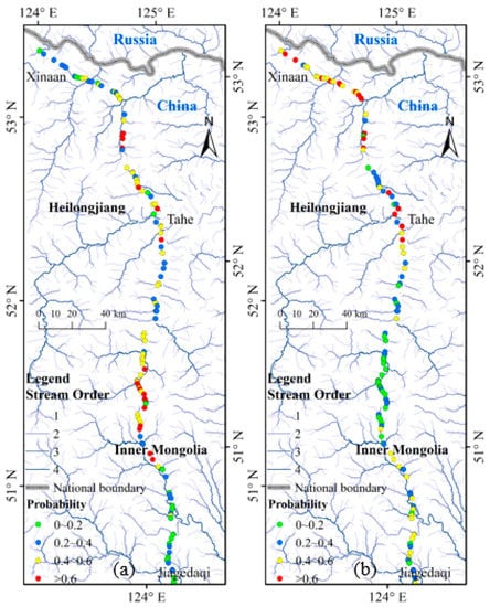 Along the pipeline, regions near rivers have higher probabilities of frost heave and thawing settlement along the pipeline than other locations. In regions south of the Jialabaqi River (K270), the probabilities are generally smaller than in places north of the river. The length of pipeline with frost heave and thawing settlement probabilities higher than 50% was 109 km, which accounted for 24.3% of the total length of the CRCOP. The length of pipe with probabilities higher than 80% was 11 km, or 2.4% of the total length. The sections of pipeline with the high probabilities of frost heave and thawing settlement were distributed in ice-rich permafrost regions.