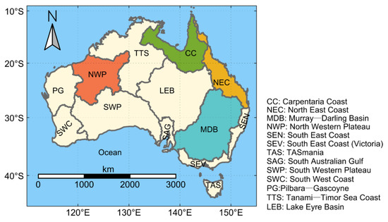 Australia is the only country in the world that covers an entire continent. This continent can be divided into 13 regions based on topographic drainage divisions [25] (Figure 1). Australia was selected as a study area due to the following reasons: first, only a reduction in leakage errors was required (the signal in a target region may leak into the surrounding areas and reduce signal amplitude in this region (leakage-out), and the signal from the surrounding areas may also leak into this region (leakage-in) and improve the signal amplitude in this region) across coastlines when GRACE data were used to analyze the TWSA over Australia [26], without considering contamination from other continents [27]. GRACE mascon solutions can easily satisfy this requirement [28] and are better for estimating small hydrological signals over Australia. Second, Australia has experienced significant spatio-temporal TWS variabilities under extreme hydroclimatic impacts [16], so measuring the water storage variations over Australia has long been proven to be a challenge for hydrological models [26]. Lastly, SMSA and GWSA are the major components of the TWSA in Australia, while snow water storage anomalies (SnWSA), canopy water storage anomalies (CWSA), and surface water storage anomalies (SWSA) are assumed to be negligible [22] (more details about these components are given in Section 2.3.1). Therefore, this feature can help us to better understand the primary water storage component that leads to the discrepancies in TWSA between GRACE data and a hydrological model. In this study, we focused on analyzing the water storage variations across the whole continent of Australia. Additionally, to help interpretation, we also quantized the water storage variations in four different regions (i.e., the Carpentaria Coast (CC), the North East Coast (NEC), the Murray–Darling Basin (MDB), and the North Western Plateau (NWP)) (Figure 1), which are typical regions of water storage changes in Australia (more details can be found in Section 3.1).