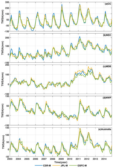Time series of TWSA from three different GRACE mascon solutions in Carpentaria Coast (CC) (a), North East Coast (NEC) (b), Murray–Darling Basin (MDB) (c), North Western Plateau (NWP) (d), and the whole continent of Australia (e).
