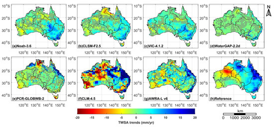 Spatial patterns of TWSA trends over Australia from seven different hydrological models (i.e., Noah-3.6 (a); Catchment Land Surface Model (CLSM-F2.5) (b); Variable Infiltration Capacity macroscale model (VIC-4.1.2) (c); Water-Global Assessment and Prognosis (WaterGAP-2.2d) (d); PCRaster Global Water Balance (PCR-GLOBWB-2) (e); Community Land Model (CLM-4.5) (f); and Australian Water Resources Assessment Landscape model (AWRA-L v6) (g)) and the corresponding reference values (h) for the period of January 2003–December 2014. The reference values of TWSA trends are shown as the ensemble means of three different GRACE mascon solutions (i.e., CSR-M, JPL-M, and GSFC-M). The gray stippling indicates regions with non-significant trends (p ≥ 0.05).