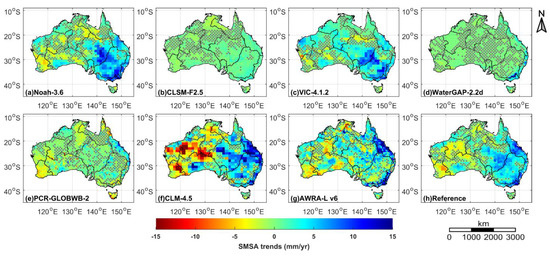 Spatial distributions of soil moisture storage anomalies (SMSA) trends over Australia from seven different hydrological models (i.e., Noah-3.6 (a); CLSM-F2.5 (b); VIC-4.1.2 (c); WaterGAP-2.2d (d); PCR-GLOBWB-2 (e); CLM-4.5 (f); and AWRA-L v6 (g)) and the corresponding reference values (h) for the period of January 2003–December 2014. The reference values of SMSA trends are shown as the ensemble means of all hydrological models, with the exception of CLSM-F2.5, WaterGAP-2.2d and PCR-GLOBWB-2 models. The gray stippling indicates regions with non-significant trends (p ≥ 0.05).