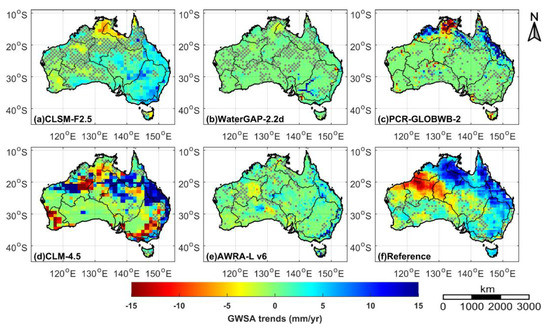 It should be pointed out that poor modeling of the influence of ocean tides and non-tide ocean mass movement can affect the GRACE water storage estimates in the nearby Gulf of Carpentaria [20,70]. However, these errors introduce a cyclical error without affecting long-term trends [40]. Additionally, a lower aquifer indicates an obvious rising groundwater level trend during 2004–2014 in the northern part of Australia from the Australian Groundwater Insight [71]. Hence, the increasing GWSA trends from the reference values in the northern part of Australia are reliable (Figure 8f). However, all of the hydrological models underestimated these increasing trends (Figure 8a–e), which could be attributed to the fact that these increasing trends are mostly expressed as GWSA trends of the lower aquifer, and all of the hydrological models may lack sufficient storage capacity to accommodate variations in deep groundwater [21].