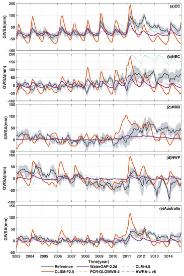 Time series of GWSA from five different hydrological models and the corresponding reference values in different regions (CC (a); NEC (b); MDB (c); and NWP (d)) and the whole continent of Australia (e). The gray-shaded area indicates the root-sum-of-squares of two uncertainties from the reference values of TWSA and the reference values of SMSA.