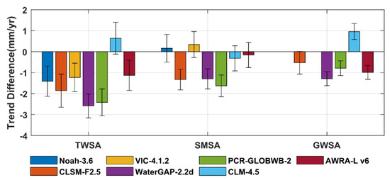 Trend differences in different water storage anomalies between hydrological models and reference values.