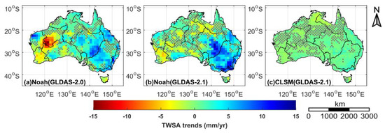 Comparison of SMSA trends over Australia (January 2003–December 2014) from three different Global Land Data Assimilation System (GLDAS) models (Noah in GLDAS-2.0 (a); Noah in GLDAS-2.1 (b); CLSM in GLDAS-2.1 (c)). The gray stippling indicates regions without significant trends (p ≥ 0.05).