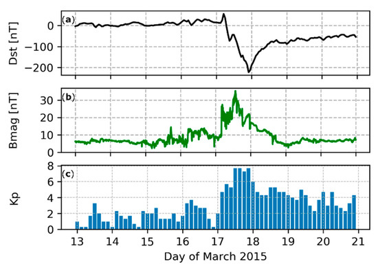 The disturbance storm time (Dst) index (a), the total interplanetary magnetic field (Bmag, b), and planetary Kp index (c), between 13 and 21 March 2015. The occurrence of a very strong geomagnetic storm on 17 March 2015 is clearly visible.