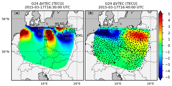 In order to determine the impact of TIDs on the position, we estimated vertical total electron content (VTEC) variations (ΔVTEC) based on observations from 650 reference stations (Figure 2b; coordinates presented in Table A1 in the Appendix A). For each station–satellite pair, ΔVTEC time series were determined according to the methodology described by Nykiel et al. [24,26]. The use of a dense network of receivers allowed us to obtain maps for individual satellites. These maps are characterized by high 0.1° spatial resolution. The time resolution was consistent with the observation data (30 s), so it was possible to compare positioning results with ΔVTEC data explicitly. Examples of ΔVTEC maps showing the movement of TIDs determined from signals of GPS satellite number 24 are shown in Figure 2. As presented by Nykiel et al. [24], during the active phase of the storm (between 16:00 and 19:00 UTC) the RMS value of ΔVTEC maps amounted to more than 1 TECU, which is significantly higher than the average value estimated for quiet days (0.1 TECU). Moreover, at this time, the main direction of the motion of the inhomogeneities was from east to west with a velocity of about 1 km/s.