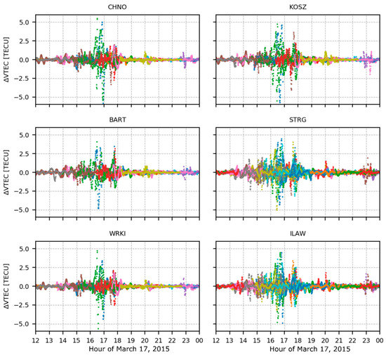 Variations of vertical total electron content (VTEC) derived from GPS/GLONASS measurements observed by the selected stations. TIDs induced by the geomagnetic storm are clearly visible between 16 and 18 UT of 17 March 2015. Different colors represent data for different observed satellites.