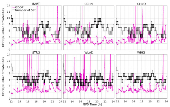 Above, we presented results for the kinematic PPP determination. Clearly, ionospheric disturbances had a considerable negative impact on solution accuracy. In this section, we discuss why this decreased accuracy is so significant. In Figure 5, the number of satellites used for position estimation is shown for each of the analyzed stations. It can be seen that, during the geomagnetic storm, the number of the used satellites falls significantly to 4, which directly translates to the value of the geometrical dilution of precision (GDOP) factor (Figure 5, the magenta line). Its value is inversely proportional to the number of satellites. Here, we can observe high GDOP values, which at some moments were even greater than 14. This means that the estimated position was characterized by a low confidence level. High GDOP values are strictly correlated with compromised accuracy, which is clearly noticeable in the presented results (Figure A1, Figure A2 and Figure A3). Above, we show epochs when the positions were estimated. However, it is worth noting that, in some cases, the number of observed satellites was so low that the position equations could not be resolved. Such data breaks occurred most often for the WLAD (23 breaks) and KOSZ (17 breaks) stations. The average number of missing epochs was 10.