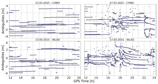 We determined the cause of these drops in the number of satellites. In Figure 6, we present the values of the estimated phase ambiguities. Clearly, no significant deterioration in ambiguity resolution was observed during calm ionospheric conditions (Figure 6, left). In contrast to this, the occurrence of ionospheric disturbances resulted in a clear degradation of ambiguity resolution at each of the analyzed stations (Figure 6, right). In most cases, this took place during two episodes, namely, at 16:00–19:00 and 22:00–24:00 GPS time, exactly at the same time as in the case of the previously analyzed disorders. The effect characterized by a leap in the phase of the signal received from the satellite is called a cycle slip (CS). As a result of a CS, a given satellite cannot be used for solving the position. When this situation occurs for many satellites, determining the high accuracy position proves impossible. Moreover, here we can observe that ambiguities estimated during the main phase of the storm are very dispersed, which makes it difficult to apply CS repairing methods.