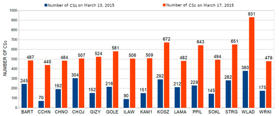 In Figure 7, the total number of CSs that occurred is shown for each of the analyzed stations. As can be seen, on the stormy day there were significantly more CSs than on the quiet day. The highest number of CSs occurred for the measurements at the WLAD station and amounted to 931 between 12:00 and 24:00 GPS time. This result is over twice as high as that observed for this station on the calm day. The second largest difference was recorded for the ILAW station, where the difference between the number of CSs for these two days was 416, meaning that the number of CSs observed on the stormy day was five times higher. Similar results were obtained for the CCHN station, where the number of the CSs observed during the stormy day was six times higher than that recorded on the calm day. The average number of CSs on the quiet day was 209, while on the stormy day it was estimated at 559, which is about 2.5 times more.