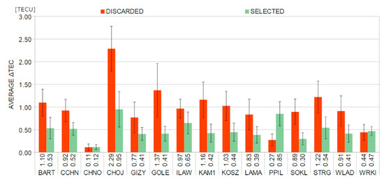 Average values of ΔVTEC for the discarded (red bars) and selected (green bars) measurements during the main phase of the St. Patrick’s Day geomagnetic storm. The average values were calculated using the absolute values of ΔTEC. The error bars are given on a 1:3 ratio.
