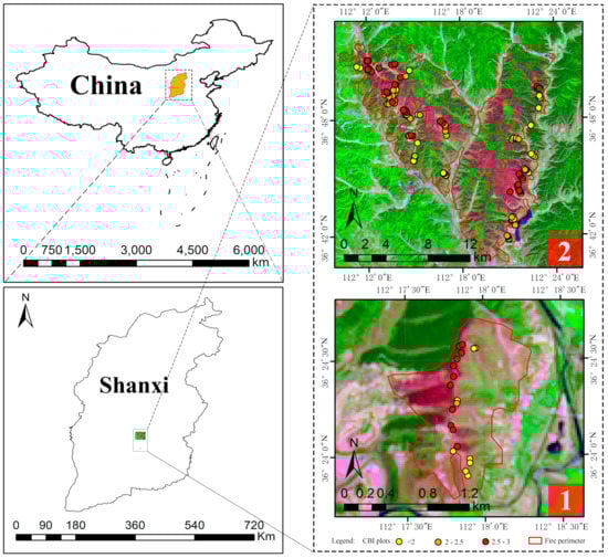 The study area is located at Qinyuan County, central China (111°58′30″E–112°32′30″E, 36°20′20″N–37°00′42″N) (Figure 1). The study area is dominated by overstory vegetation of Pinus tabuliformis while the middle vegetation layer is dominated by low Quercus acutissima and Rosa xanthine and the grass over the soil surface are dominated by Gramineous weeds. Under the management of the local government’s policy of closing hills for reforestation, the vegetation growth in the study area is very dense, and the TCC in most areas is more than 50%. The height of Pinus tabulaeformis in the study area ranged from 3 to 5 m, which has a positive correlation with fire behavior []. Pinus tabulaeformis will become very flammable in dry and hot weather for a long time. At the same time, pine balls will help the fire spread faster with the help of wind. The topography of the study area is rugged, and the altitudes range from 1020 to 1639 m. The average annual rainfall in this region is 656.7 mm. The average annual relative humidity is 65% and the average annual temperature is 8.7 °C. Maximum and minimum precipitations were recorded in July–September and November–March, respectively. From November to March there is little precipitation, and the temperature will continue to rise from about −10 °C to 15 °C. During this period, sparse precipitation and temperature rise will help forest ecosystems accumulate large amounts of dry and flammable fuels. Generally, the fire season begins in March and ends in May.