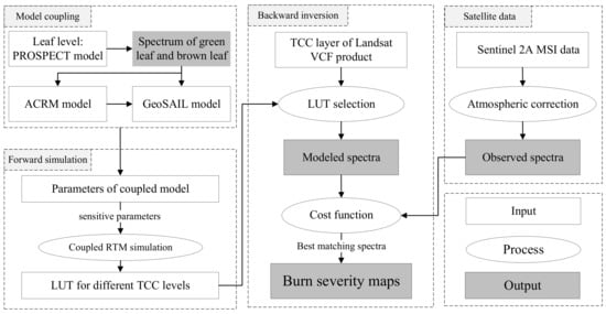 The methodology to retrieve burn severity using coupled RTM is carried out in four steps (Figure 2): (i) remote sensing data preprocessing, including the atmospheric correction of the Sentinel 2A MSI data and resampling of the Landsat VCF product; (ii) couple RTMs of leaf and canopy level for burn severity retrieval; (iii) forward modeling, including the parameterization of the coupled RTM based on the sensitivity analysis results of previous studies and construction of the LUT []; and (iv) Coupled RTM backward inversion procedure by finding the simulated surface reflectance (saved in the LUT) that most similar to the extracted spectrum from satellite remotely sensed data by use of a cost function []. The coupled RTM can simulate the radiative transfer characteristics of three-layer vegetation and has greater potential to accurately estimate burn severity worldwide given it directly accounts for variation in TCC to avoid misclassify burn severity without the need of determining a site-specific stand density–TCC relationship.