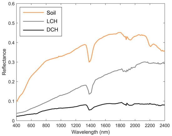 The reference spectrum used as post-fire background layer: soil (brown curve), dark charcoal (DCH; black curve), and light charcoal (LCH; a mixture of charcoal and ash, grey curve). The reference spectrum was provided by De Santis.