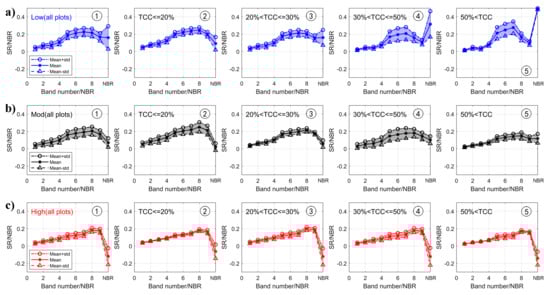 Mean and standard deviations (std) of the Sentinel-2A MSI spectral signatures of plots with (a) low, (b) moderate, and (c) high burn severities and TCC ranges. The x-axis represents the nine spectral bands and post-fire NBR, and the y-axis represents the value of the reflectance (SR) and post-fire NBR. The first column represents the reflectance from all field plots without constraining TCC; other columns represent the reflectance statistics in different TCC levels.