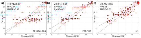 Field measured versus estimated burn severity (expressed as CBI) based on (a) CP_RTM+GOS, (b) FRT+TCC, and (c) RF method for two study sites. The dotted line and solid line represent the 1:1 line and fitting line, respectively.