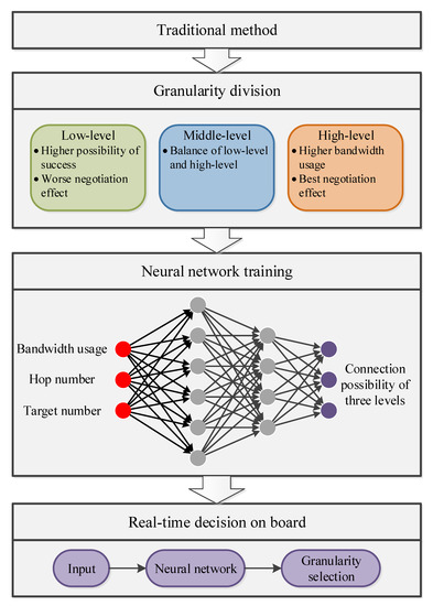 To finish negotiation with limited communication resources, a multi-granularity negotiation method was developed. Firstly, the traditional multi-agent negotiation model is divided into three levels of granularity: low-level granularity, middle-level granularity, and high-level granularity. Mission selection algorithms were designed for each level of granularity. A fixed consistency algorithm is used to realize the decentralization of the satellite cluster. After that, we designed different negotiation processes and consistency mechanisms to simplify the negotiation process of different granularity. Secondly, different samples on different target numbers, bandwidths and transmit hop numbers were collected to train a neural network. Finally, the best neural network was established to select the best granularity onboard. The flowchart of the multi-granularity negotiation method proposed in this paper is illustrated in Figure 1.