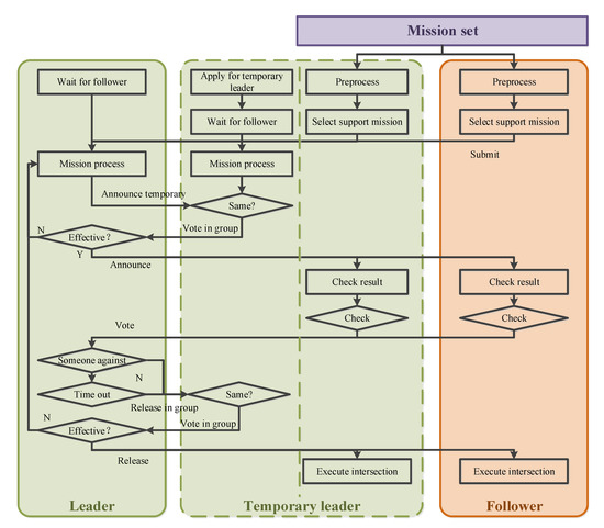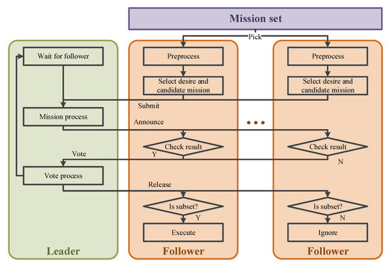 - Step 8: Vote process. If all Followers vote in favor or negotiation fails times too much, the Leader stops negotiations and goes to Step 9. If not, the Leader adjusts the set of mission stages still using a greedy algorithm and then goes to Step 6.
