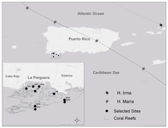 Study area at southwestern Puerto Rico with Hurricanes Irma and María paths. Sampling sites and delimited areas represent submerged coral reef areas that support fisheries and economies around the region. Base map was from ESRI®.
