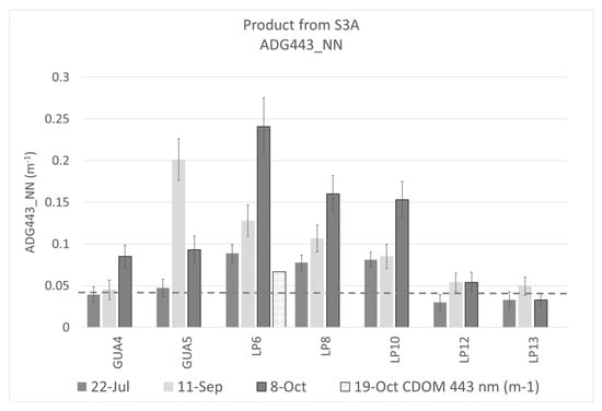 ADG443_NN product from Sentinel 3A for 22 July, 11 September, and 8 October 2017; the figure includes the aCDOM at 443 nm field data on 19 October 2017, at LP6 sampling site. The dashed line represents the second standard deviation (2SD) for aCDOM443 field data.