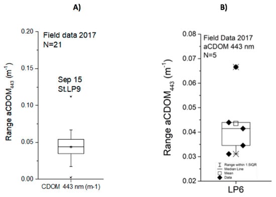 Box plots for field data showing the median, mean and data including the extreme values (A) Summary of the absorption coefficient of colored dissolved organic matter (aCDOM) at 443 nm field data for the year 2017. (B) The absorption coefficient of colored dissolved organic matter (aCDOM) at 443 nm field data on station LP6, alias Turrumote II, for 2017.