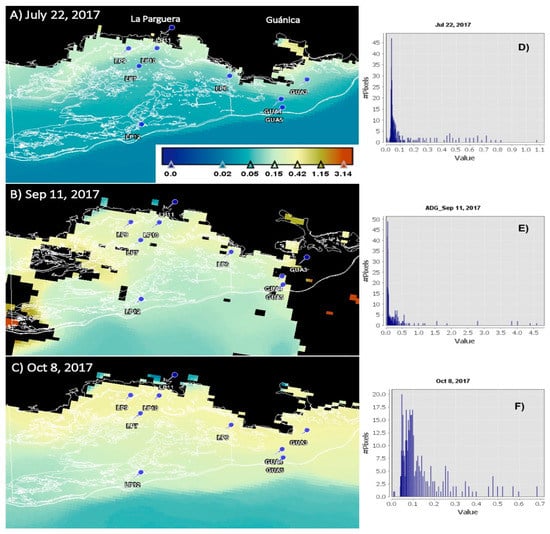 Sentinel 3A ADG_443_NN product (median visualization). Contour lines represent coral reefs as the region of interest (ROI) while the perpendicular lines represent the limits of La Parguera Natural Reserve. Black areas represent land-mask and cloud-mask applied to the imagery (A) before the hurricanes on 22 Jul 2017 (B) 11 Sep 2017 after Hurricane Irma and (C) Oct 8, 2017 after two hurricane events (H. Irma and H. María); (D) Histograms for regions of interest representing ADG443_NN pixel values on 22 July 2017, (E) 11 September 2017 and (F) 8 October 2017.