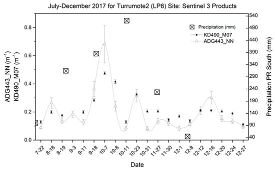 S3A OLCI products from July to December 2017 showing the changes over time for station LP6 known as Turrumote II (located between Guánica Bay (GB) and La Parguera Natural Reserve (LPNR)) for ADG443_NN and Kd490_M07 and monthly precipitation at Guayanilla, Puerto Rico (PR) south station.