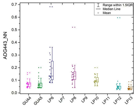 S3A OLCI Product ADG_443_NN from Sentinel 3A (EUMETSAT-Copernicus data) from July to December 2017 at selected sampling sites in southwestern, PR. The graph shows the range per site, median line, mean, data points, and extreme values.