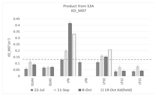 Kd490 product from Sentinel 3A for 22 July, 11 September, and 8 October 2017. The figure includes the Kd490 nm field data on 19 October 2017 at LP6 sampling site. The dashed line represents the second standard deviation (2SD) for Kd490 field data.