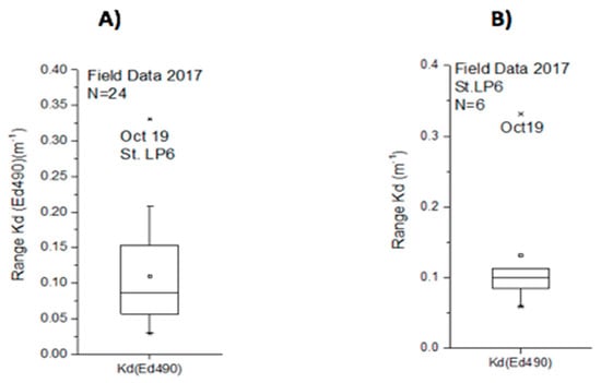 Box plot for light attenuation coefficient (Kd490) at 490 nm field data, showing the value range, median line, mean, and the extreme values (A) for the year 2017 from GB to LPNR area and, (B) field data on station LP6 known as Turrumote II for 2017.