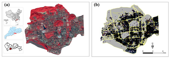 The study area is located in the Futian District (Figure 2a) of Shenzhen City, Guangdong Province, China. Due to its special geographical location adjacent to Hong Kong, Futian District has been developing rapidly with advanced political, economic and cultural functions, and it is considered as the center of Shenzhen. According to the Annals of Statistics, Futian District has a total area of 78.66 km2 and a permanent population of 1,501,700.