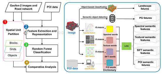 A general framework was proposed to map land use by fusing the POI and remote sensing image, and it includes four parts (Figure 3): (1) Spatial unit partition: the study area is partitioned into small spatial units, which is the smallest unit to fuse features from HSR images and POI data, and is also the smallest unit for land cover mapping. (2) Semantic feature construction: Low-level image features including spectral, textural and scale invariant feature transform (SIFT) features and POI features of each spatial unit were calculated, and were further promoted to high-level semantic features using the LDA model. Playgrounds were also extracted and used as a semantic feature. Besides, landscape metrics were calculated using a land cover map, which was obtained using object-based image classification of the HSR image. (3) A set of training data were selected, and an RF classifier was used for a feature importance analysis and land use classification of the whole study area. (4) Finally, by using three different partition methods, and repeating steps (1) to (4), three different land use maps were obtained, and then a comparative analysis was carried out to explore the impact of spatial unit on land use mapping with multisource data.