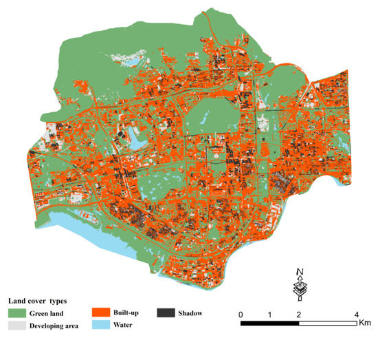 Landscape metrics is widely used in urban land use classification [32,45], due to its good performance. In this study, an object-based land cover classification process was carried out [46], and it classified images into built-up areas, green land, water, developing areas and shadow areas. The land cover map is presented in (Figure 4).