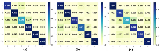 Confusion matrix of three different partition methods. (a) Block, (b) Grid, (c) Object. (R—Residential; C—Commercial, P—Public, E—Educational, U—Urban village, N—Natural).