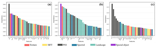 A total number of 114 features were used for urban land use classification in this study (Figure 3), including 22 landscape metrics, 73 spectral/textural/SIFT features, 18 Gaode POI features, and 1 special object feature. Figure 6 shows the rankings of feature importance (Top 30) using three different partitions. The importances of features are quite different among the different partition methods.