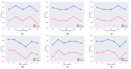 Figure 8a–c shows the relationship between V with the corresponding accuracy, and Figure 8d–f shows the variation of accuracy when the topic number K is changed. As Figure 8a and b show, the number of words was set as 200 and 400 making the accuracy reach the peak for spectral and textural features, and 200 is the best set for the SIFT feature. After selecting the number of visual words, we found that the numbers of topics to ensure the highest accuracy for the spectral, textural and SIFT features are 23, 23 and 15, respectively. Table 7 shows the best parameters finally selected for the LDA model.