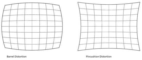 The pinhole model does not consider that real lenses may produce several different non-linear distortions. The major defects in cameras are the radial distortion, caused by light refraction differences along with the spherical shape of the lens. Other distortions, like the tangential distortion, which is generated when the lens is not parallel to the imaging sensor or when several component lenses are not aligned over the same axis, have minor relevance in quality objectives and will not be considered in this study. The radial distortions can usually be classified as either barrel distortions or pincushion distortions (Figure 2), which are quadratic, meaning they increase as the square of the distance from the center.