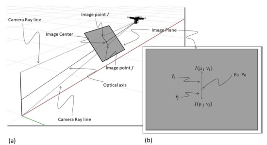 - The intrinsic parameters must be known. For those cases where the UAV camera specs are not available, the intrinsic parameters (image principal point, focal length, and skew and distortion coefficients) can be retrieved using a calibration procedure [17] provided, for example, by computer vision open libraries such as OpenCV [18]. Intrinsic parameters can also be obtained from a bundle adjustment of regular photo coverage with highly convergent images [19].