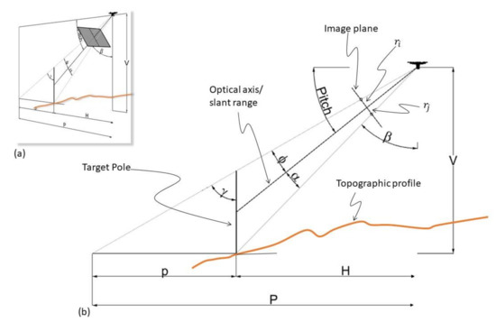 Positional UAV readings (position of the UAV in WGS84 geographic coordinates) and camera pitch angle of each image were extracted from EXIF tags while the number of pixels spanning upward from image principal point () and downward () were measured manually on screen. The Lat–Long coordinates of each image were plotted into a GIS environment along with the position of the reference pole to measure the horizontal distance (H values, as graphically described in Figure 6).