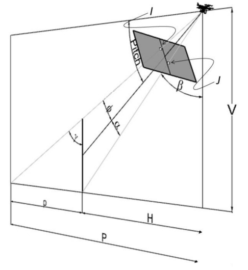 The next paragraph describes how to estimate the height of a target standing vertically (pole) considering the elements discussed so far in this paper. As an example, we can use a lightweight UAV like the DJI Phantom 4 PRO but the approach can be extended to any imaging system installed in steerable moving platforms.