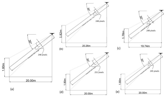 Firstly, let us consider the following scenario: a DJI Phantom 4 PRO is looking at a target of 1.80 m, the laser range finder (this UAV does not have a laser range finder, but we assume it would have one) measured a slant range distance of 23.1 m from the target (equal to 20 m horizontally), the total number of pixels spanning the feature for this case would be 248 (see Figure 8a). If the laser range finder has an uncertainty of ±0.30 m (±0.26 m horizontally), the real horizontal distance of the UAV to the target must be included between 19.74 m and 20.26 m (see Figure 8b,c). In this case, we could say that the error associated with the estimated height is ±0.02 m (varying from 1.78 m to 1.82 m as shown in Figure 8b,c). Moreover, in this case, the difference in elevation between the UAV and the target is not known because we do not have the coordinates of the target. Let us now consider the other possible source of error: the number of pixels is miscounted (this can be ideally indicated as error of collimation, where, basically a camera ray line is not collimating to the top or bottom of the target). Practical experience has shown that there might be an error of uncertainty of ±3 pixels considering a simple linear vertical feature like a pole, this uncertainty takes place at the top and at the bottom of the feature. If the target is more “complex” than a pole (like a person) this uncertainty could be more than 3 pixels. Considering the same situation described above (DJI Phantom 4 PRO looking at a target of 1.80 m, 20 m horizontal distance, 30 deg Pitch), an uncertainty of ±3 pixels at the top generates an error in the estimation of the height equal to ±0.021 m (see Figure 8d,e where the error is exaggerated to underline the issue). The same uncertainty at the bottom of the feature generates an error of 0.023 m. These two errors, although quite similar, should be kept separate because they may vary significantly for pitch assuming high values.